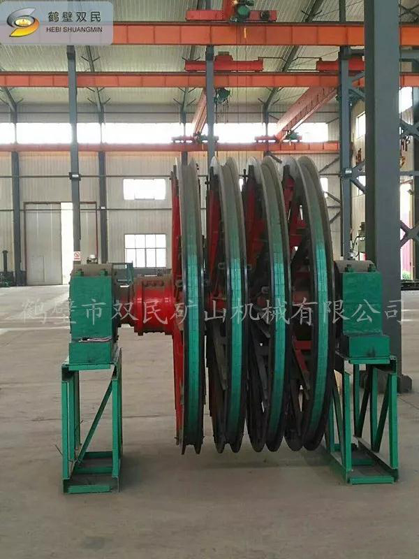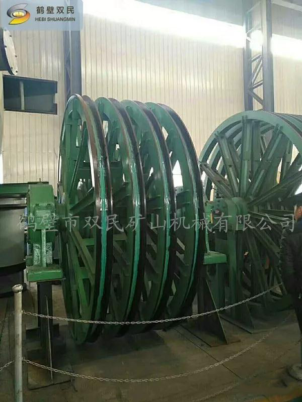 天輪由軸、天輪、滾動軸承、軸承座等組成, 一個天輪固定在軸上,稱為固定天輪,其余天輪其輪轂內(nèi)嵌一個銅套,活裝在軸上,對軸可作相對轉(zhuǎn)動,以消除因各條提升鋼絲繩的速度差對天輪的滑動摩擦。